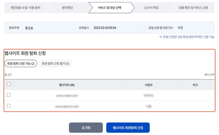 4. 서비스 및 대상 선택: 회원탈퇴를 원하는 웹사이트를 선택합니다.