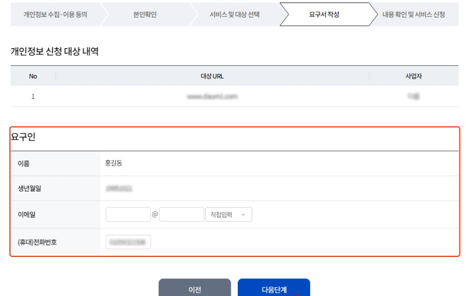 5. 요구서 작성: 이메일과 휴대전화번호를 입력합니다.